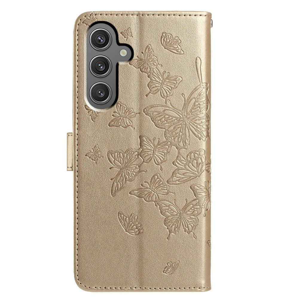 Etui do telefonu Samsung Galaxy A34 5G z nadrukiem motyla, podstawką do portfela, wegańską skórzaną klapką i paskiem - Złote