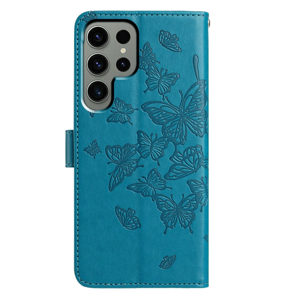 Etui Samsung Galaxy S24 Ultra z nadrukiem motyla, portfelem i podstawką, wegańska skórzana klapka z paskiem - Niebieskie