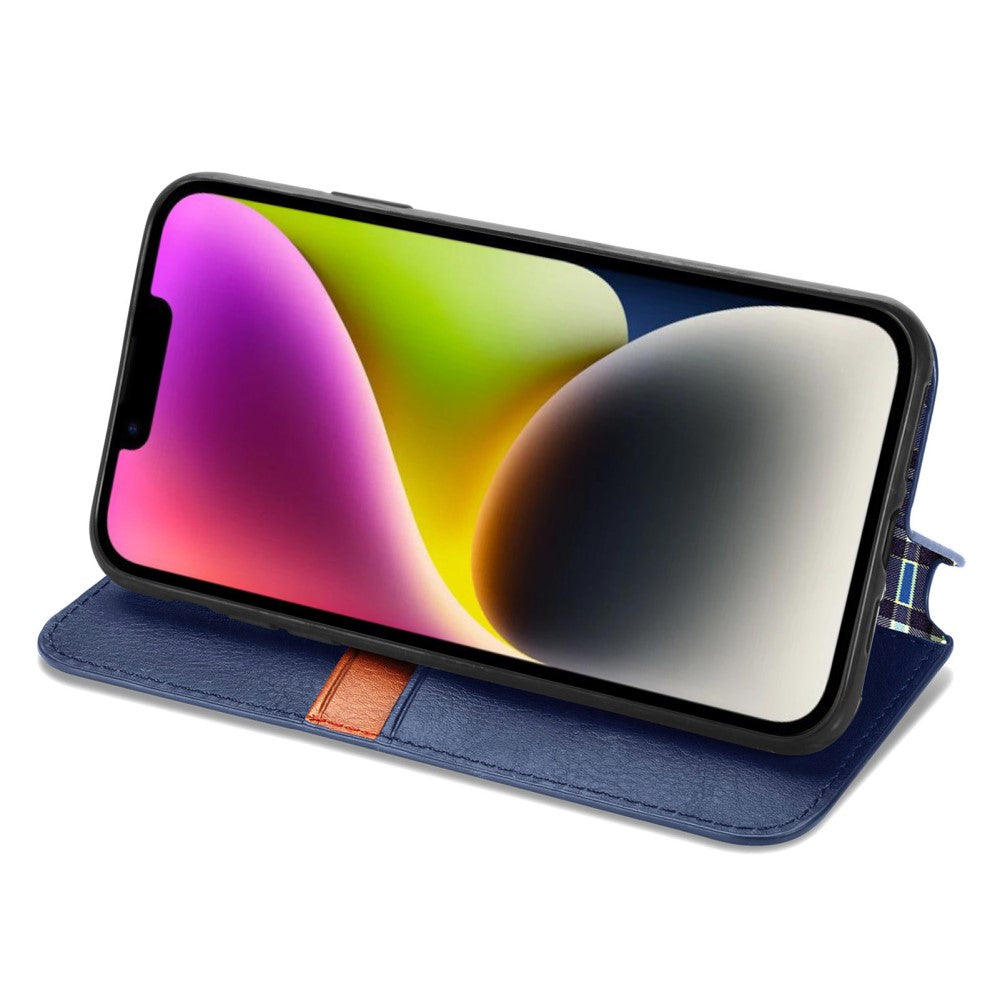 Leather case with a stylish rhombus imprint for iPhone 15 Plus - Blue