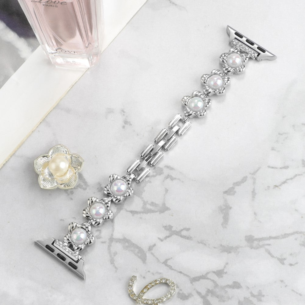 Metalowy pasek w kwiaty ze sztuczną perłą do Apple Watch Series 8 (45 mm) / Watch Ultra - Srebrny