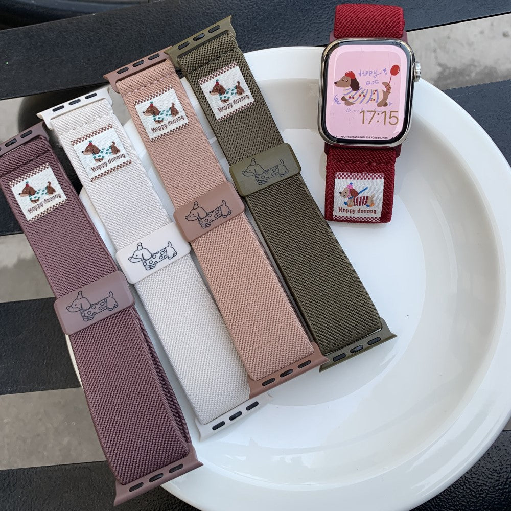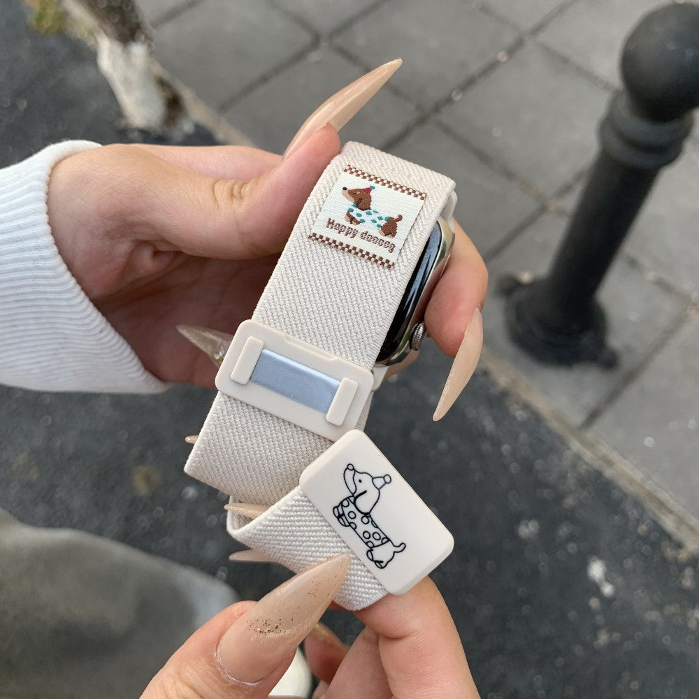 Nylonowy, elastyczny pasek do zegarka Apple Watch Series 41mm - 40mm - 38mm z wzorem jamnika i magnetyczną klamrą - Biały