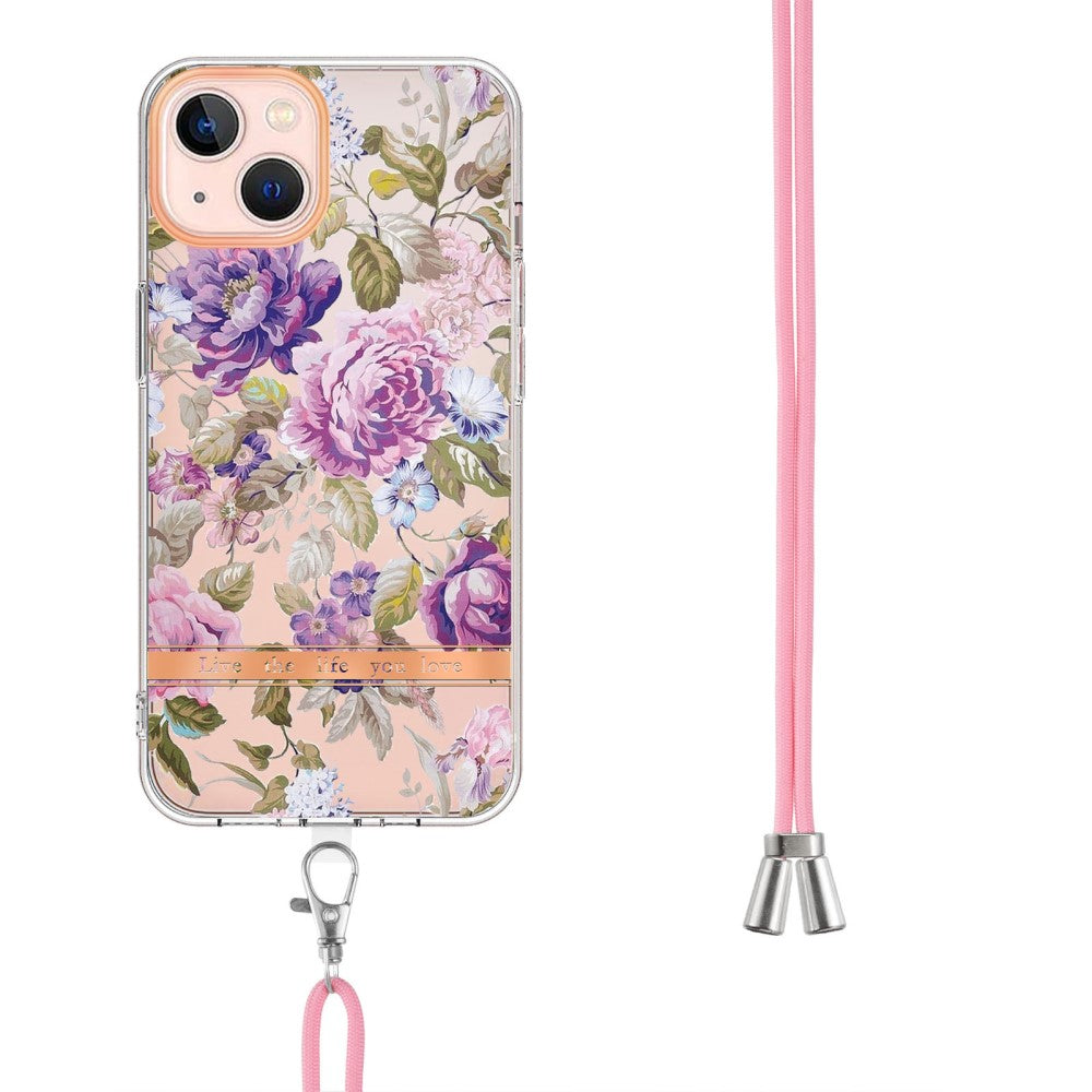 Smukła i wytrzymała miękka okładka ze smyczą do iPhone'a 15 Plus - Hc006 Purple Peony
