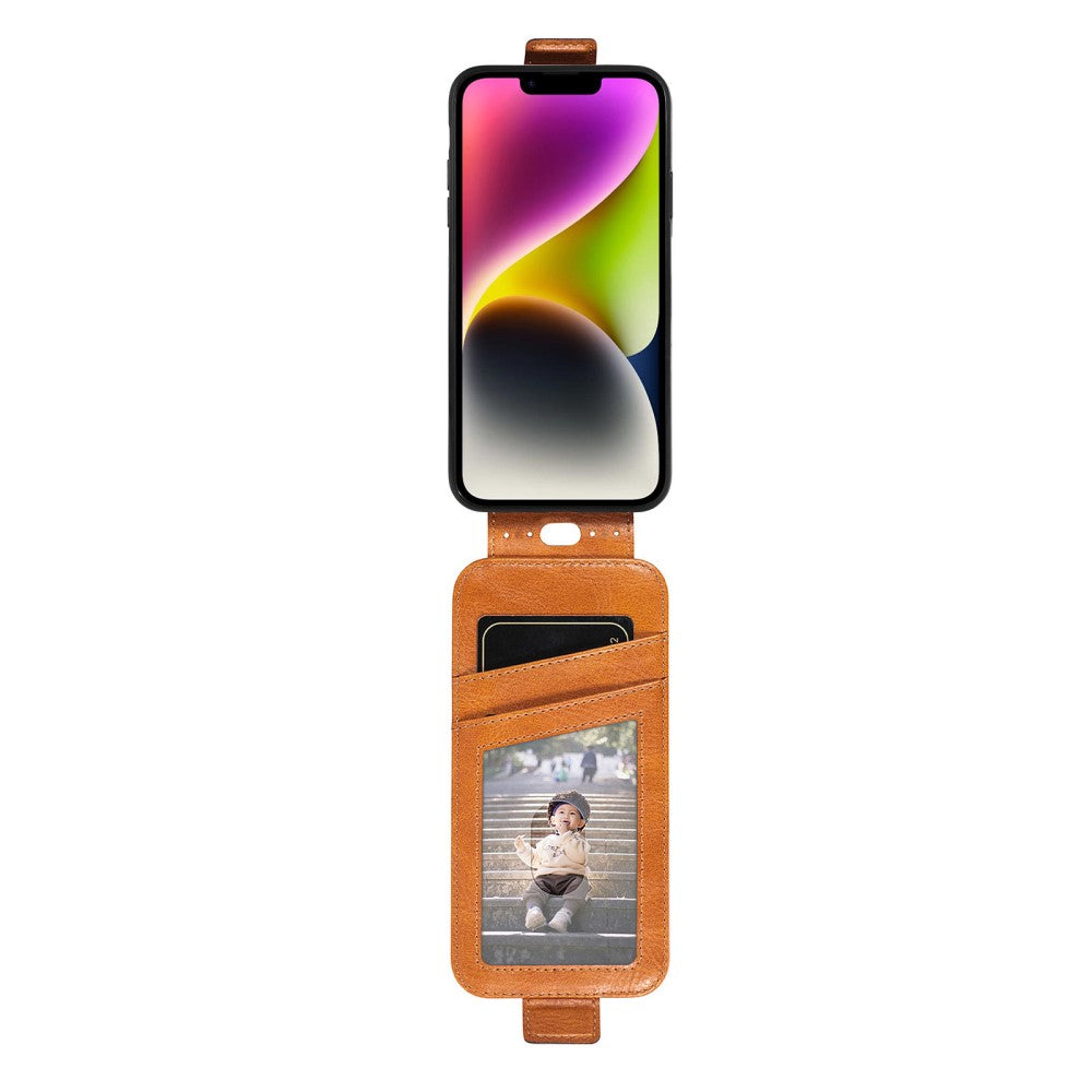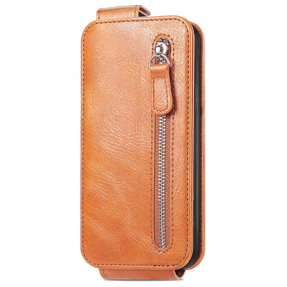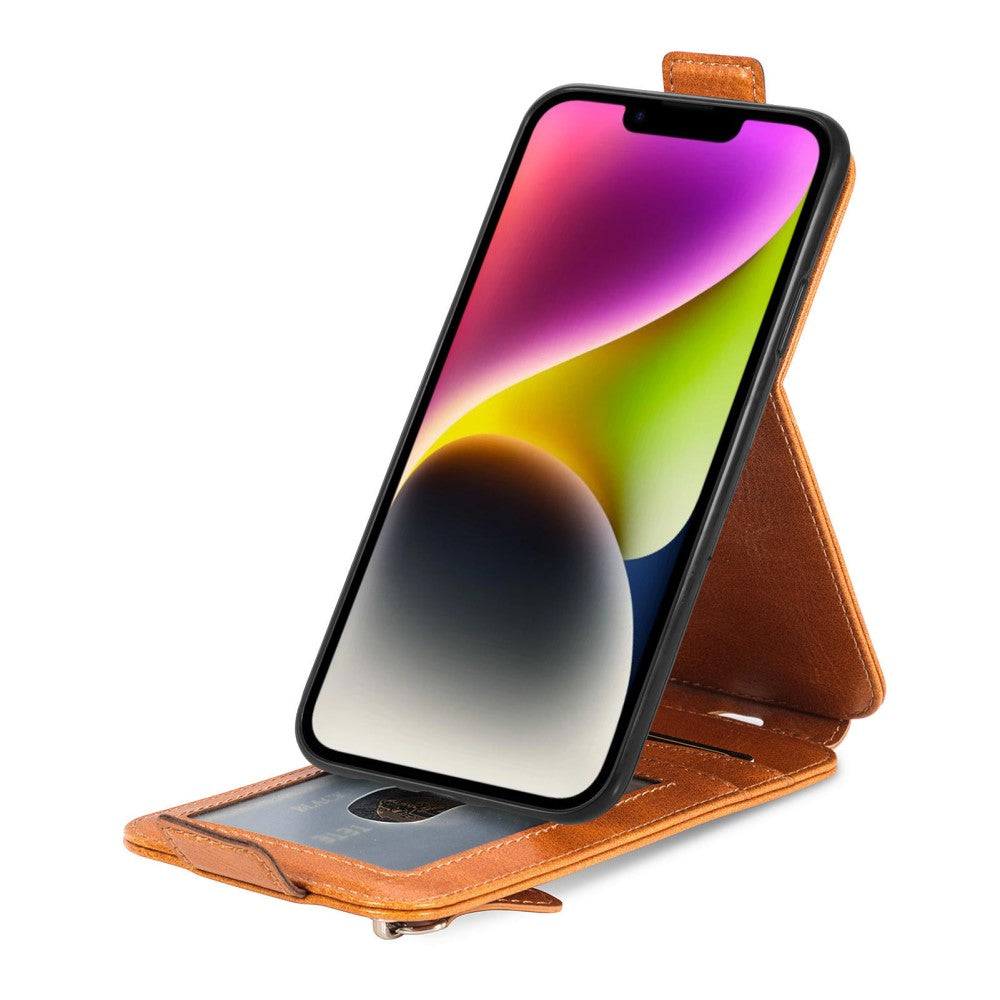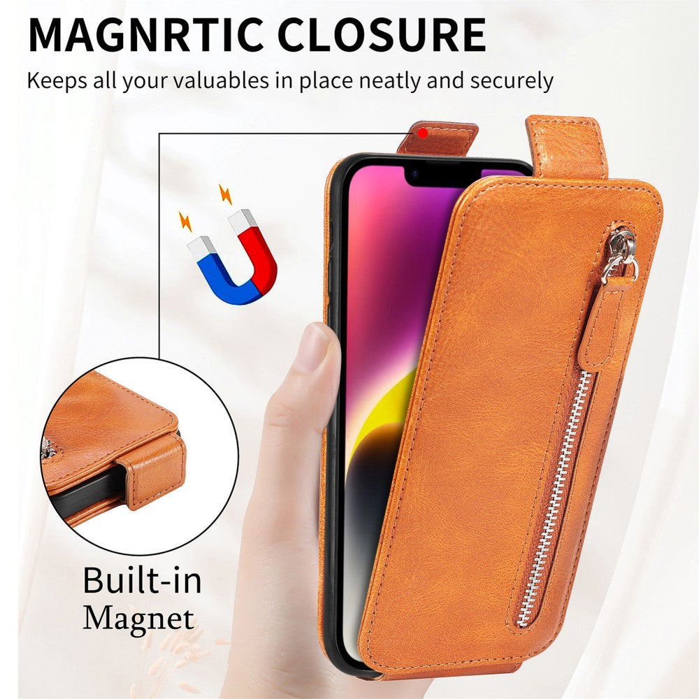 Vertical flip phone case with zipper for iPhone 15 Plus - Brown