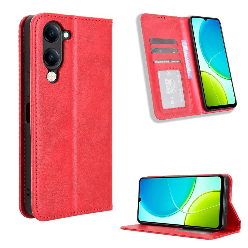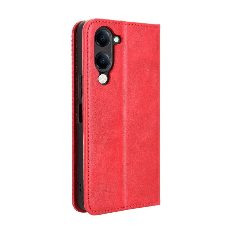 vivo Y29s 5G / vivo Y04 4G Retro Vegan Leather Case Phone Wallet Stand Cover - Czerwony