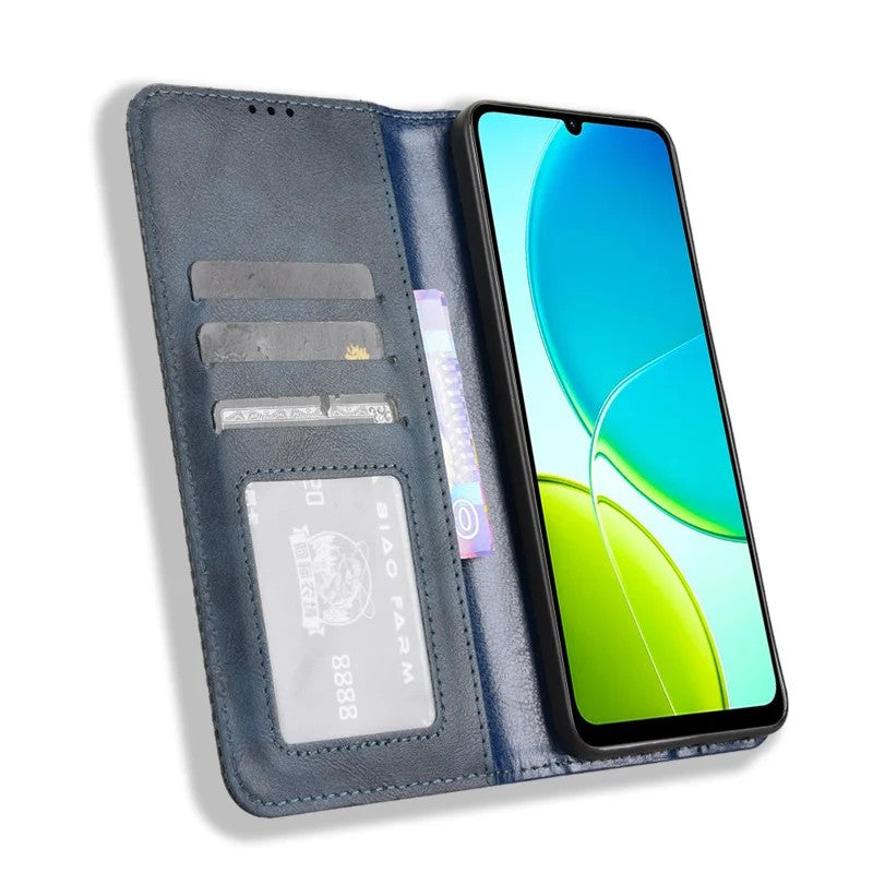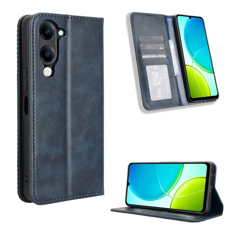 vivo Y29s 5G / vivo Y04 4G Retro Vegan Leather Case Phone Wallet Stand Cover - Niebieski